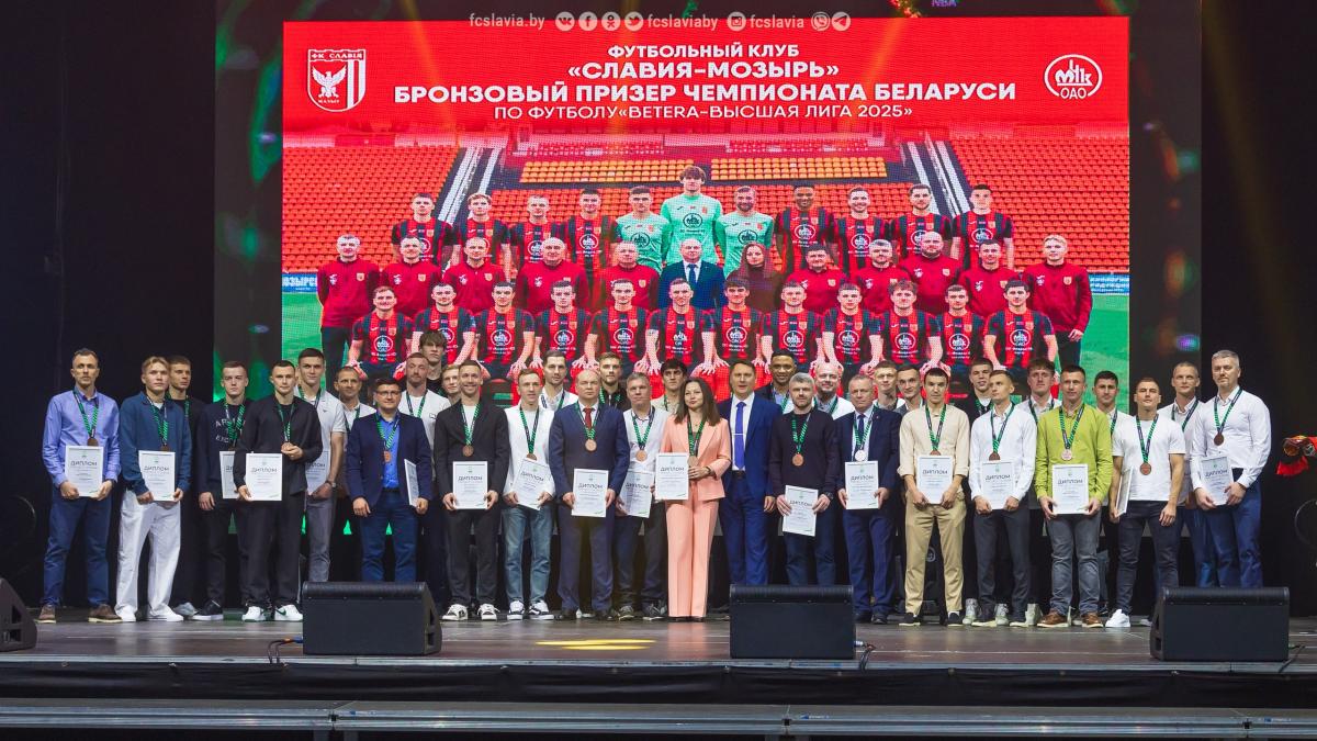 5 декабря 2025 года в ФОЦ «Полесье-Арена» состоялось торжественное мероприятие по случаю чествования бронзовыми наградами футбольного клуба «Славия-Мозырь». Событие вызвало небывалый ажиотаж не только среди болельщиков и любителей футбола. Разделить радость с командой и тренерским штабом пришли почетные гости. Среди них, заместитель председателя Гомельского облисполкома Андрей Барановский, председатель Мозырского райисполкома Елена Павлечко, начальник управления спорта и туризма Гомельского облисполкома Павел Старосветский, генеральный директор ОАО «Мозырский НПЗ» Виталий Павлов, а также первый заместитель «Ассоциация Белорусская федерация футбола» Андрей Василевич. Организаторы сделали из мероприятия целое музыкальное представление, в котором нашлось место и ярким шуткам от дуэта ведущих, и теплым словам от почетных гостей, и неординарному спичу Ивана Биончика, и, красивым музыкально-танцевальным номерам от творческих коллективов Мозырского района, и, конечно же, награждению главного героя вечера – ФК «Славия-Мозырь». Но обо всем по порядку.